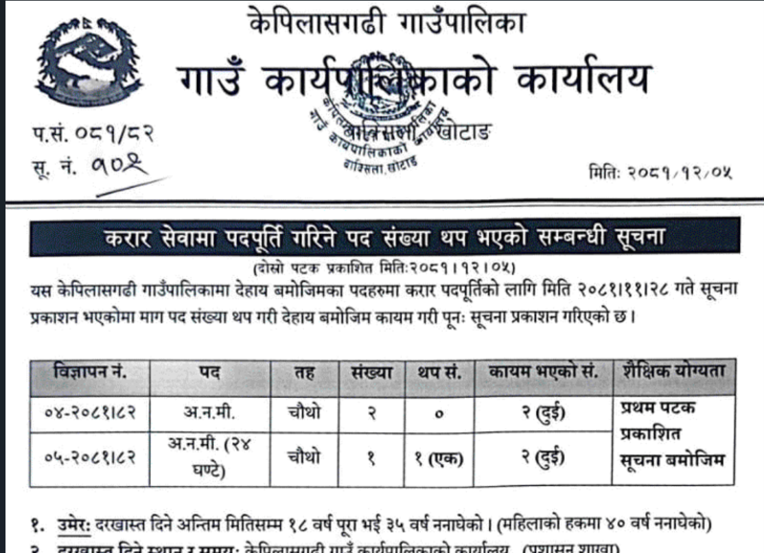 Kepilasgadhi Rural Municipality Contract Job Vacancy for ANM