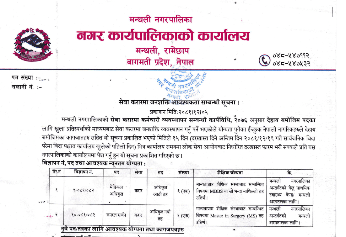 Manthali Municipality Vacancy for Medical Officer and General Surgeon