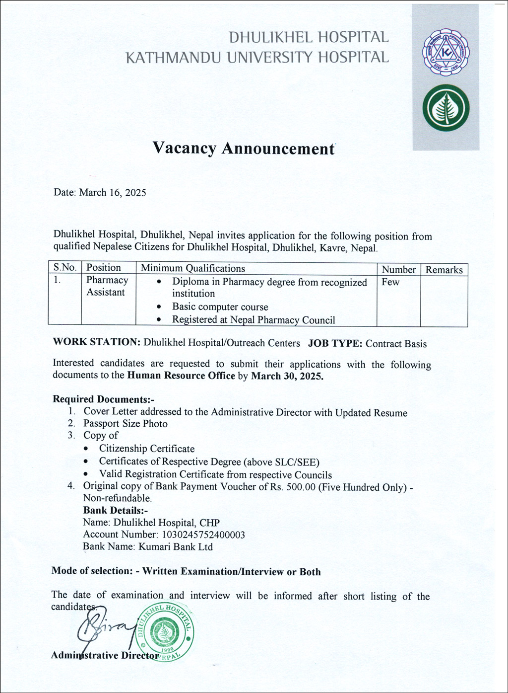 Vacancy Announcement for the Post of Pharmacy Assistant at Dhulikhel Hospital