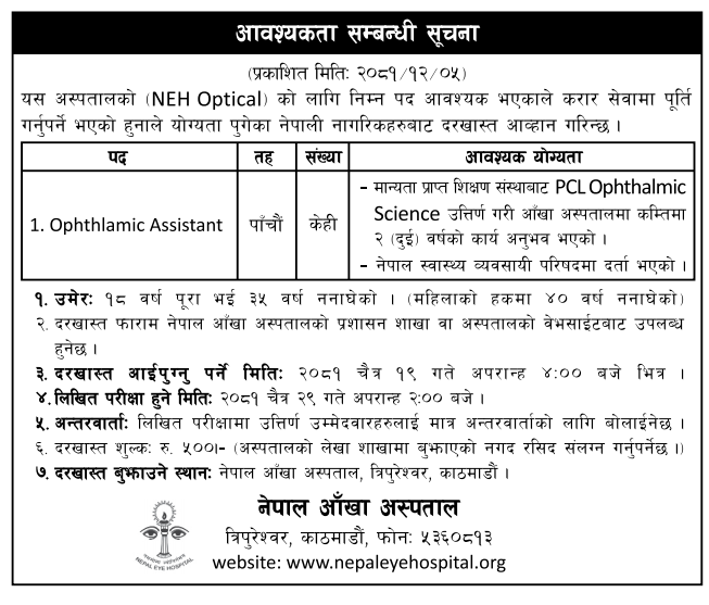 Ophthalmic Assistant आवश्यकता सम्बन्धी सूचना