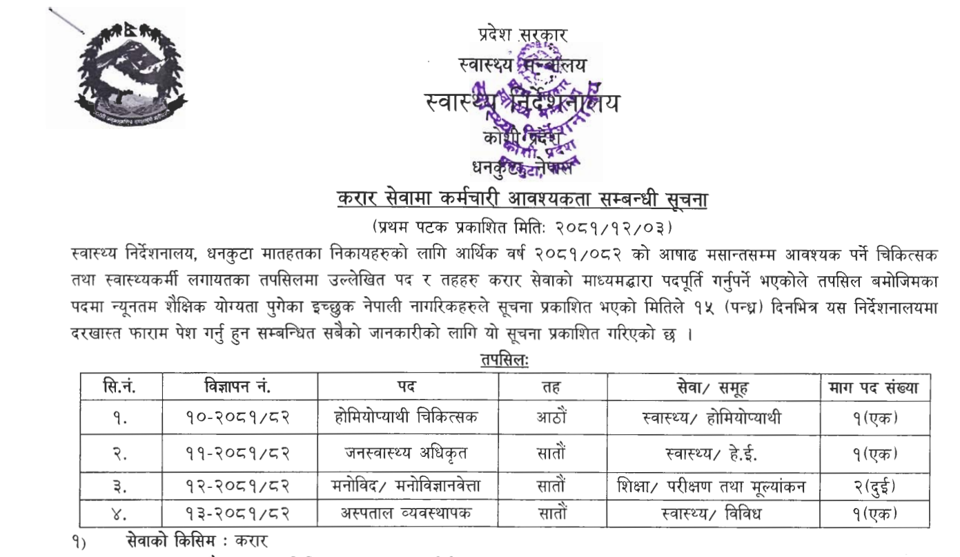 करार सेवामा कर्मचारी चिकित्सक तथा स्वास्थ्यकर्मी आवश्यकता सम्बन्धी सूचना