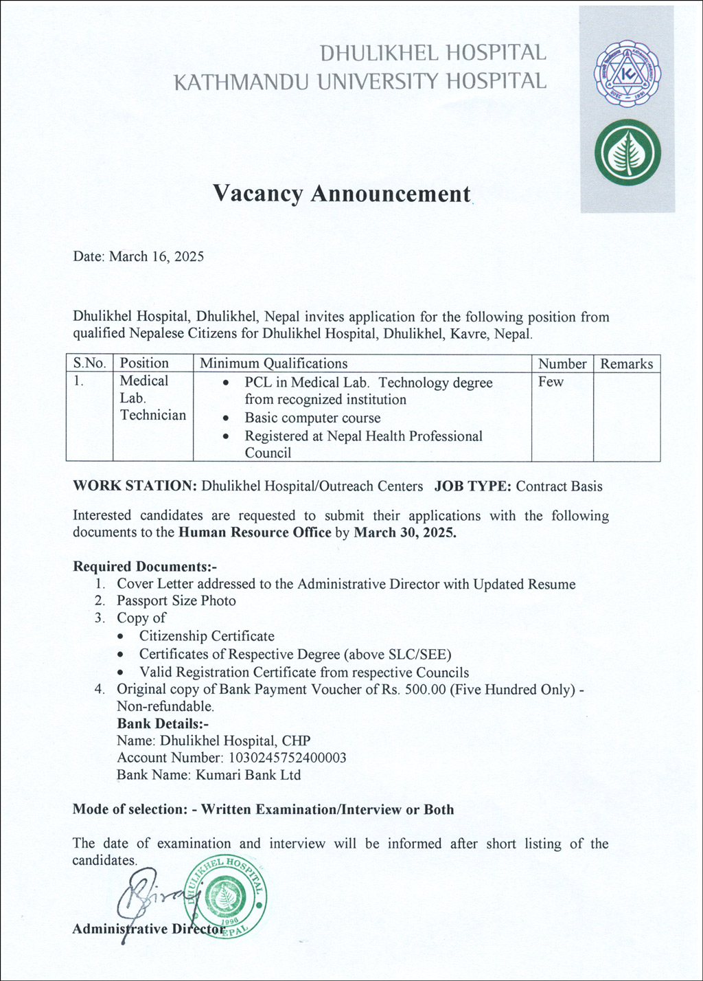 Vacancy Announcement for the Post of Medical Lab Technician at Dhulikhel Hospital