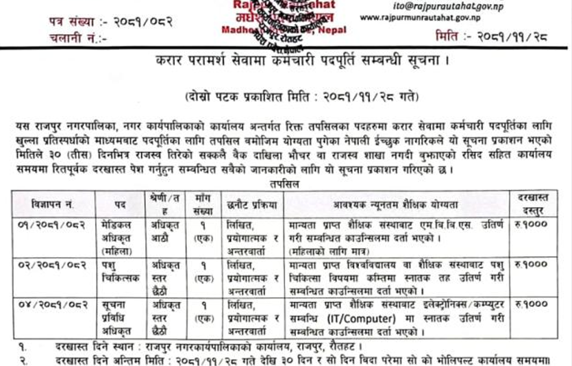 राजपुर नगरपालिका रौतहटमा करार सेवामा कर्मचारी आवश्यकता