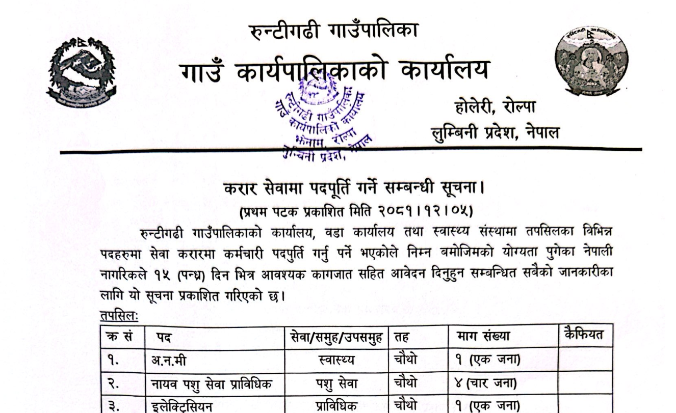 रुन्टीगढी गाउँपालिका झेनाम (होलेरी),रोल्पामा कर्मचारी आवश्यकता सम्बन्धी सूचना