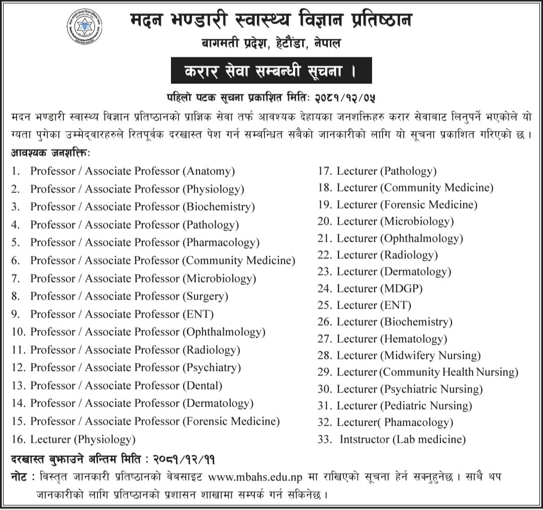 मदन भण्डारी स्वास्थ्य विज्ञान प्रतिष्ठान हेटौँडामा कर्मचारी आवश्यकता