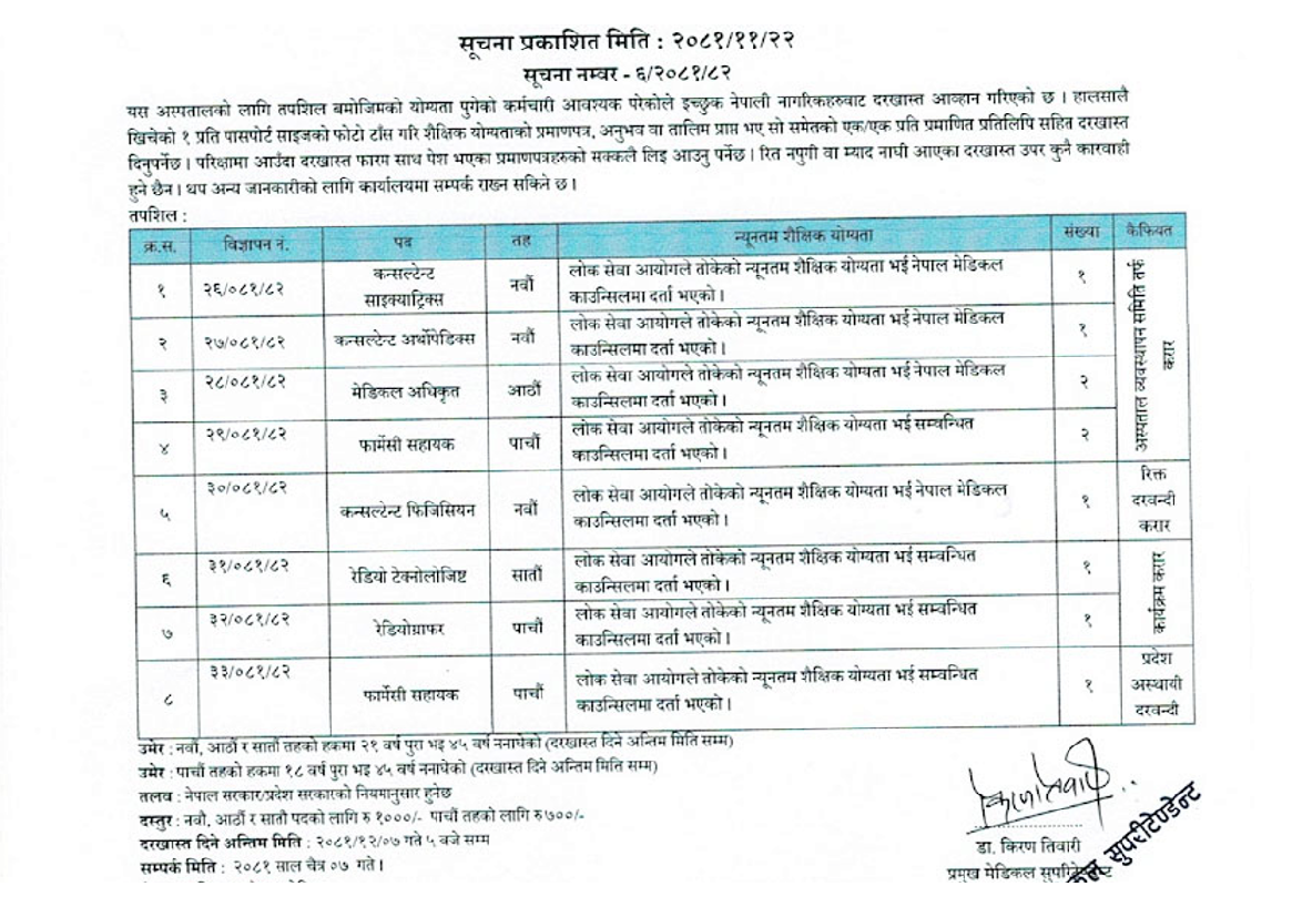 धौलागिरी प्रादेशिक अस्पतालमा कर्मचारी आवश्यकता सम्बन्धी सूचना