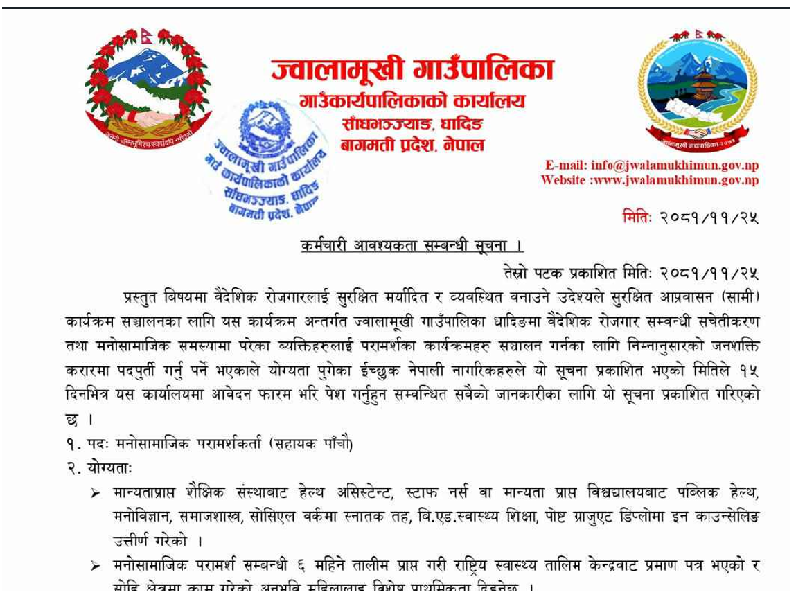 ज्वालामूखी गाउँपालिका धादिङमा मनोसामाजिक परामर्शकर्ता आवश्यकता सम्बन्धी सूचना
