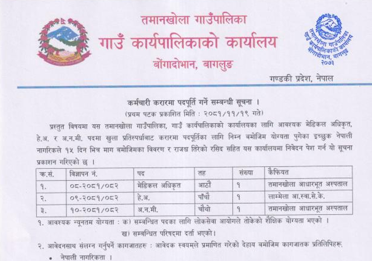 तमानखोला गाउँपालिकामा कर्मचारी आवश्यकता सम्बन्धी सूचना