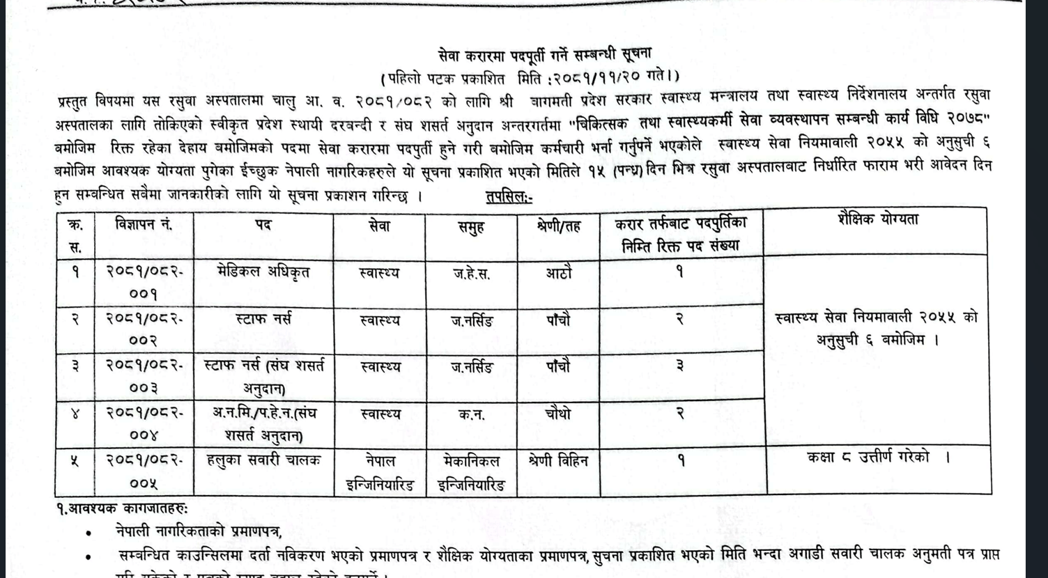 रसुवा अस्पतालमा कर्मचारी आवश्यकता सम्बन्धी सूचना