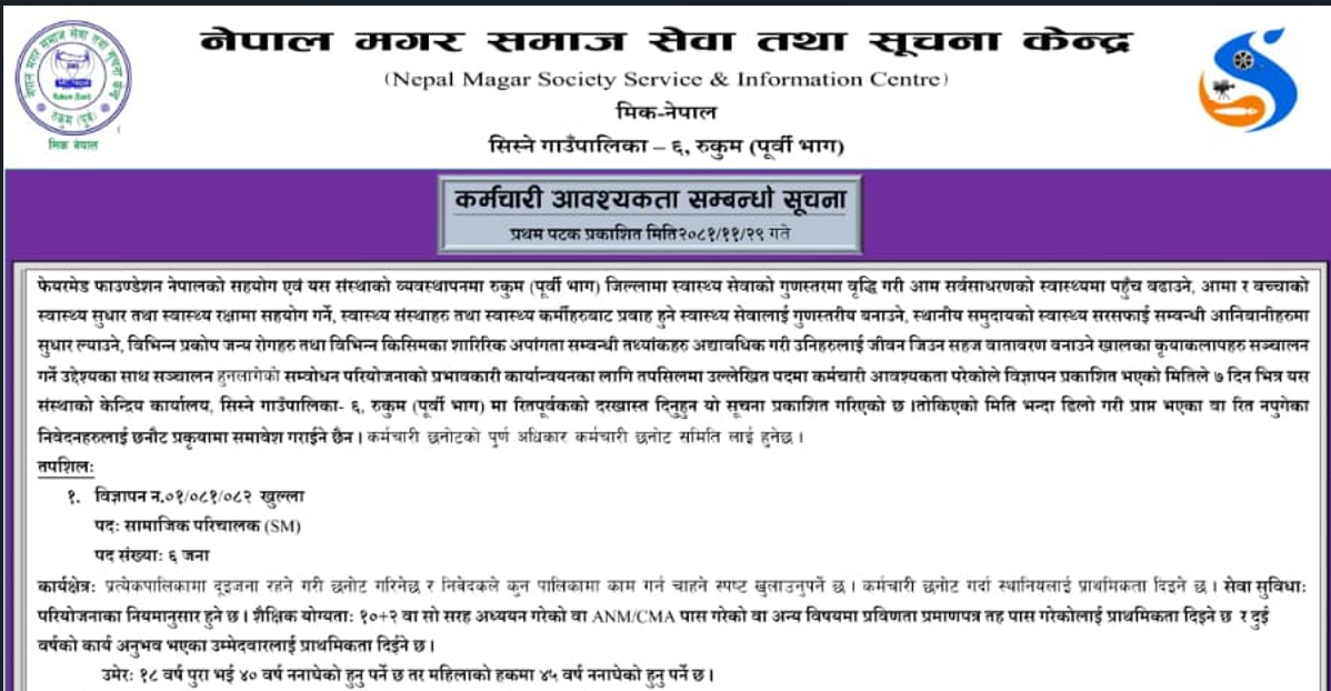 नेपाल मगर समाज सेवा तथा सूचना केन्द्रमा कर्मचारी आवश्यकता सम्बनधी सूचना