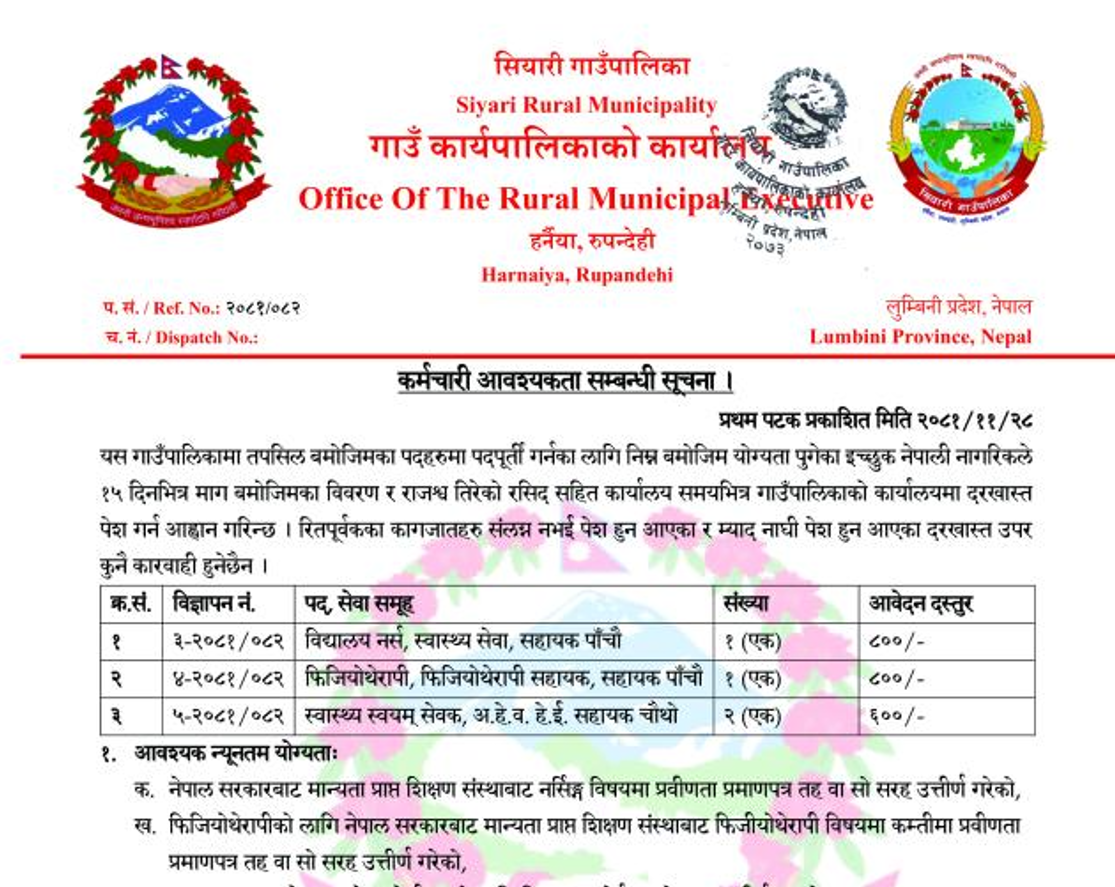 सियारी गाउँपालिका रुपन्देहीमा कर्मचारी आवश्यकता सम्बन्धी सूचना