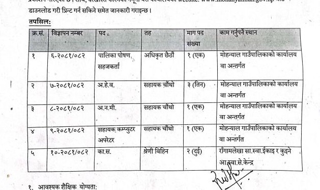 मोहन्याल गाउँपालिकामा कर्मचारी आवश्यकता सम्बन्धी सूचना