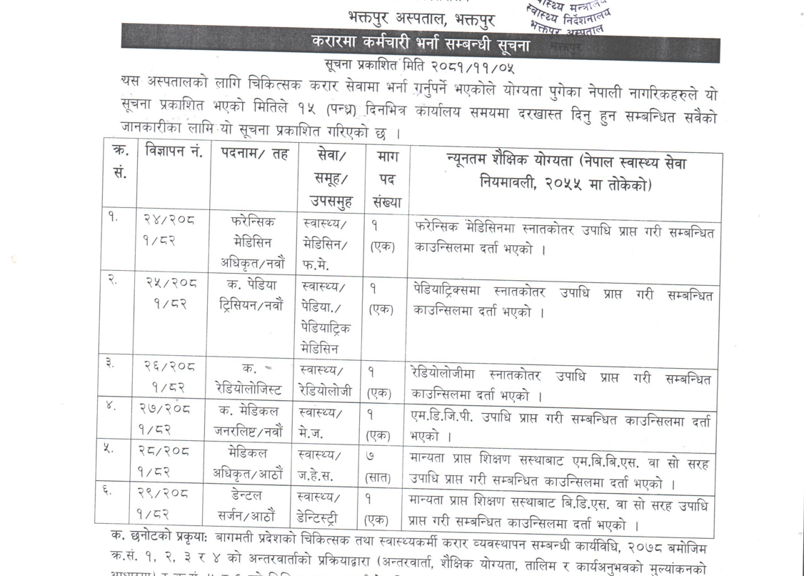 भक्तपुर अस्पतालमा करार सेवामा कर्मचारी आवश्यकता सम्बन्धी सूचना