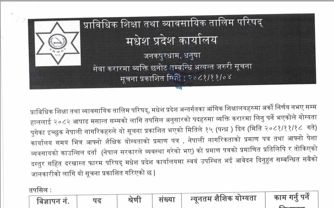 CTEVT को सेवा करारमा कर्मचारी आवश्यकता सम्बन्धी सूचना