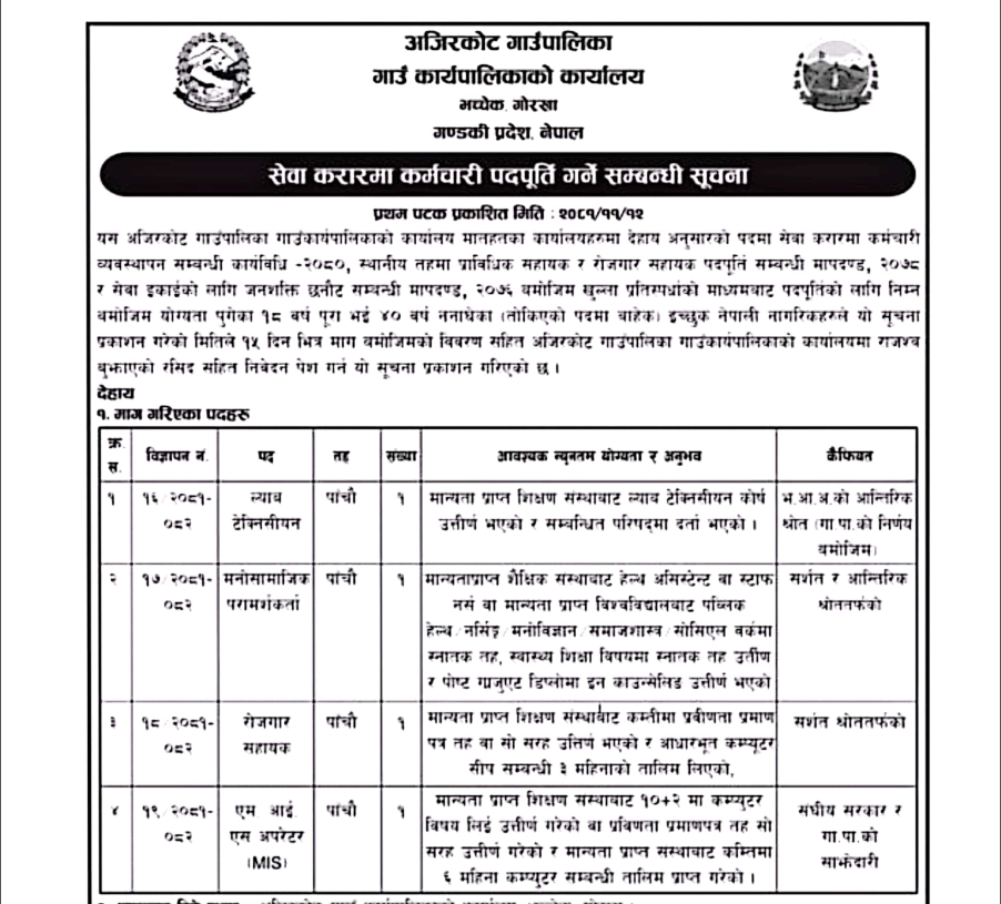 अजिरकोट गाउँपालिकामा कर्मचारी आवश्यकता सम्बन्धी सूचना