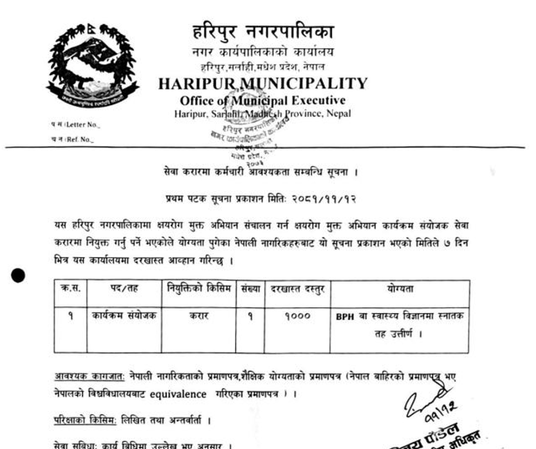 हरिपुर नगरपालिका सर्लाहीमा क्षयरोग मुक्त अभियान कार्यक्रमका लागि कार्यक्रम संयोजक करारमा लिने सम्बन्धी सूचना !
