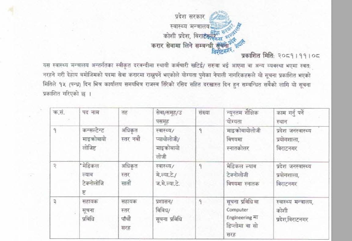 कोशी प्रदेश स्वास्थ्य मन्त्रालयमा कर्मचारी आवश्यकता