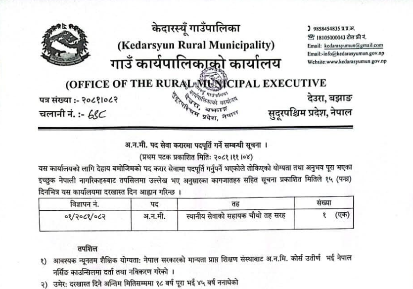 केदारस्युँ गाउँपालिकामा अ.न.मी. आवश्यकता सम्बन्धी सूचना