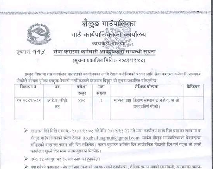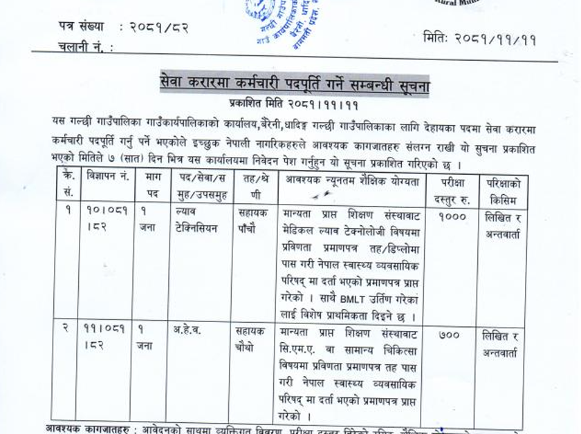 गल्छी गाउँपालिकामा कर्मचारी आवश्यकता सम्बन्धी सूचना