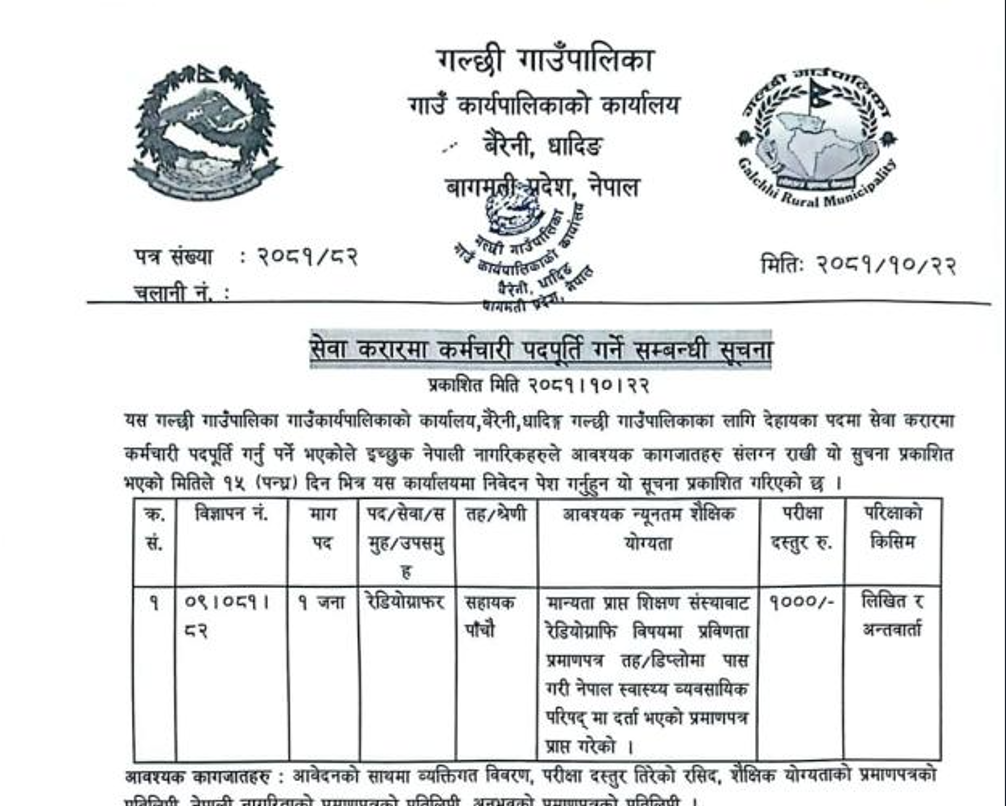 गल्छी गाउँपालिका बैरेनी धादिङको सेवा करारमा रेडियोग्राफर पदपूर्ति गर्ने सम्बन्धी सूचना
