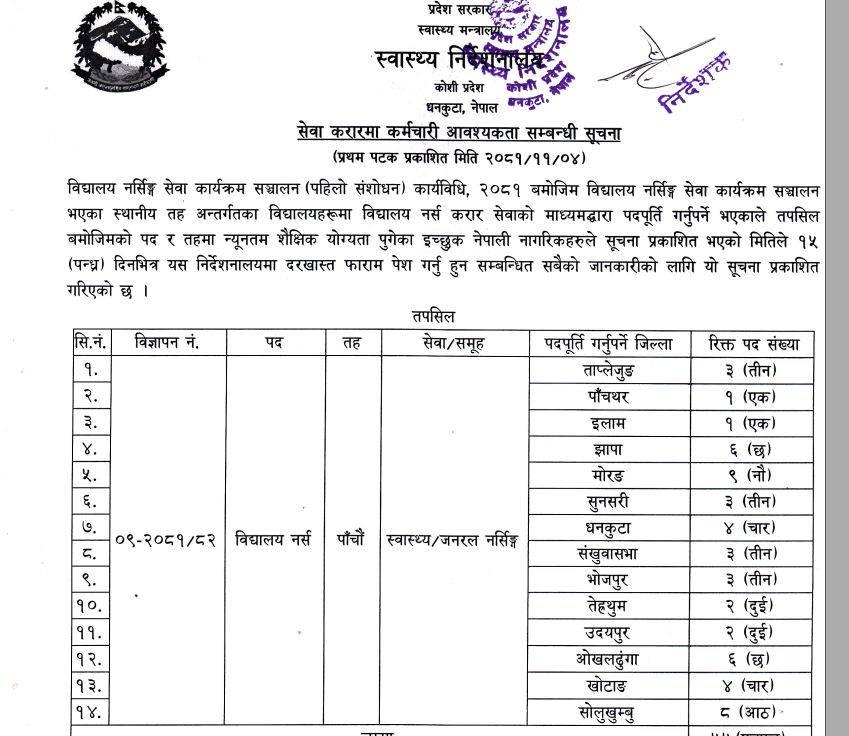 कोशी प्रदेशमा ५५ जना विद्यालय नर्स आवश्यकता सम्बन्धी सूचना !