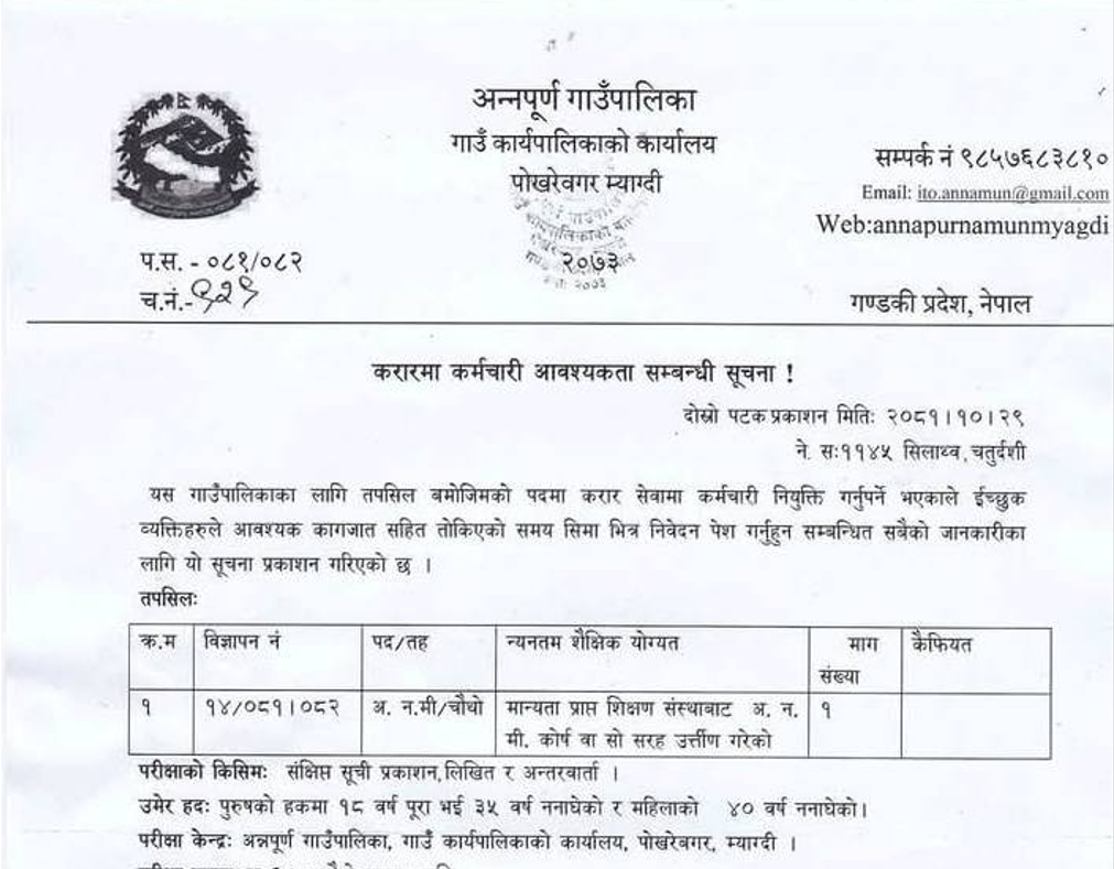 अन्नपूर्ण गाउँपालिका म्याग्दीमा अ.न.मी. आवश्यकता सम्बन्धी सूचना