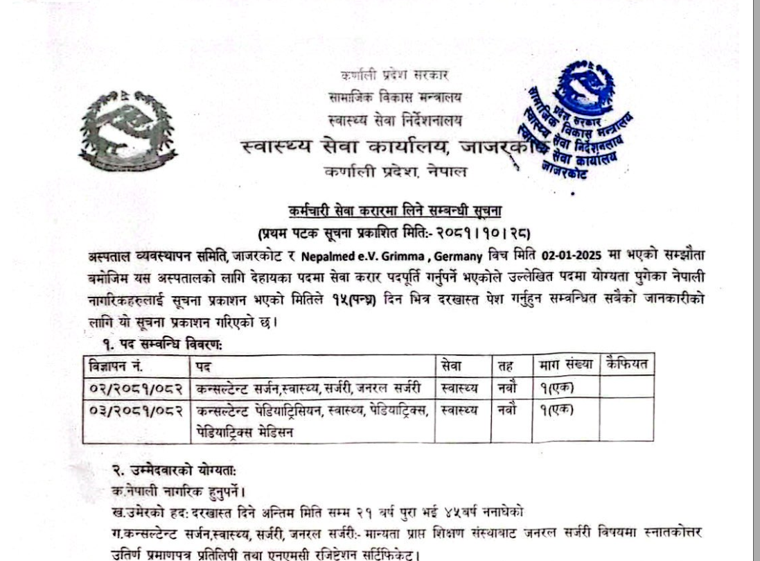 जाजरकोट अस्पतालमा चिकित्सक आवश्यकता सम्बन्धी सूचना
