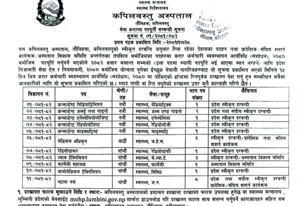 कपिलवस्तु अस्पताल तौलिहवा, कपिलवस्तुमा चिकित्सक र स्वास्थ्यकर्मी आवश्यकता सम्बन्धी सूचना