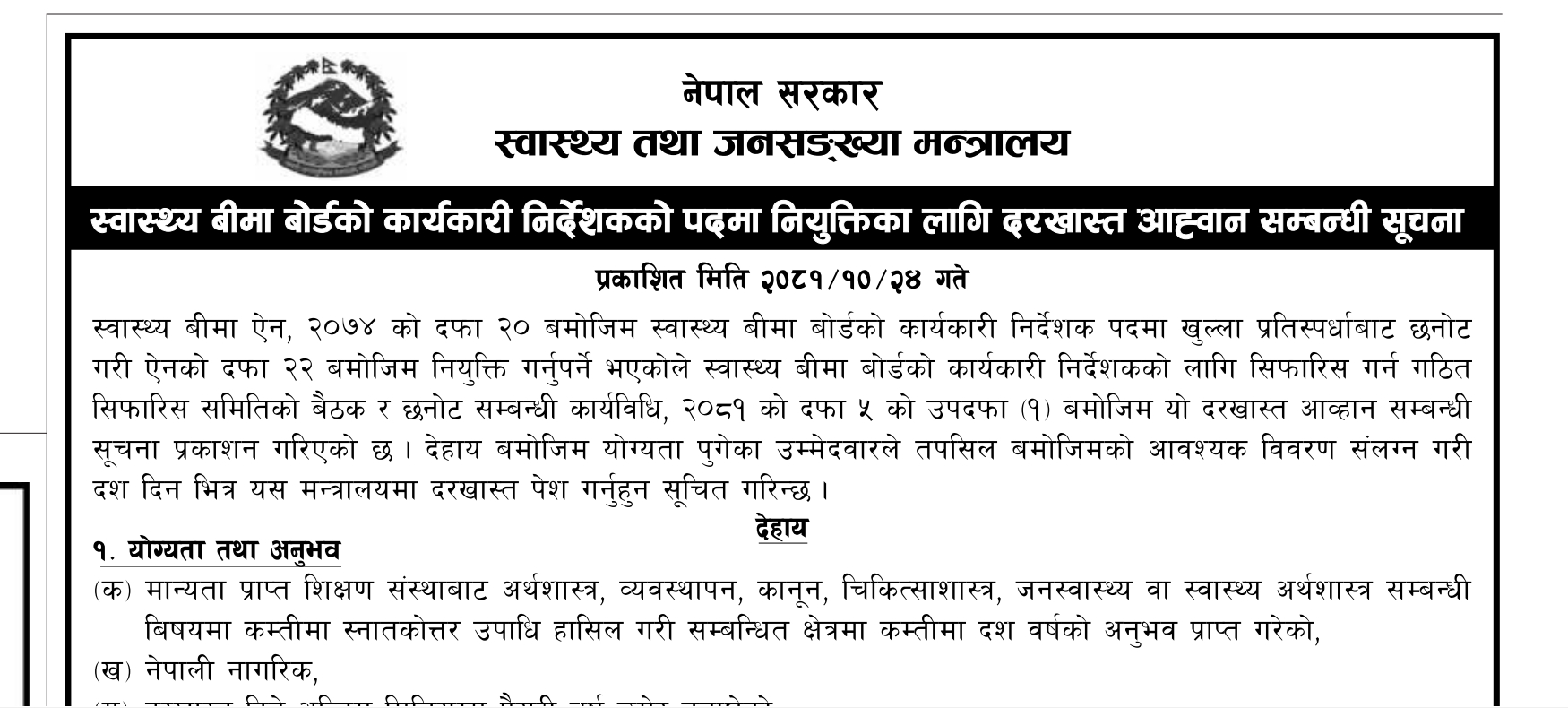 स्वास्थ्य बीमा बोर्डको कार्यकारी निर्देशकको पदमा नियुक्तिका लागि दरखास्त आह्वान सम्बन्धी सूचना