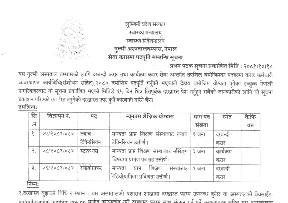 गुल्मी अस्पताल गुल्मीमा कर्मचारी आवश्यकता सम्बन्धी सूचना