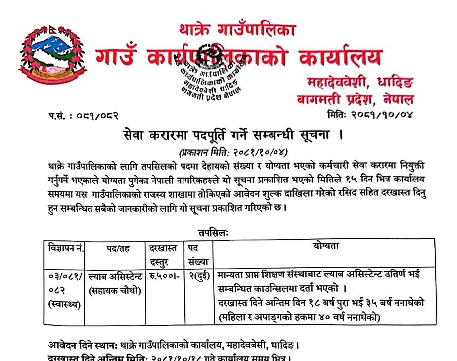थाक्रे गाउँपालिका धादिङमा ल्याव असिष्टेण्ट आवश्यकता सम्बन्धी सूचना