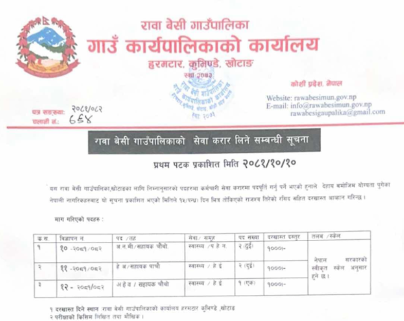 रावा बेसी गाउँपालिकामा कर्मचारी आवश्यकता सम्बन्धी सूचना