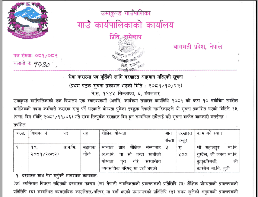 उमाकुण्ड गाउँपालिका रामेछापमा अ.न.मी. आवश्यकता सम्बन्धी सूचना