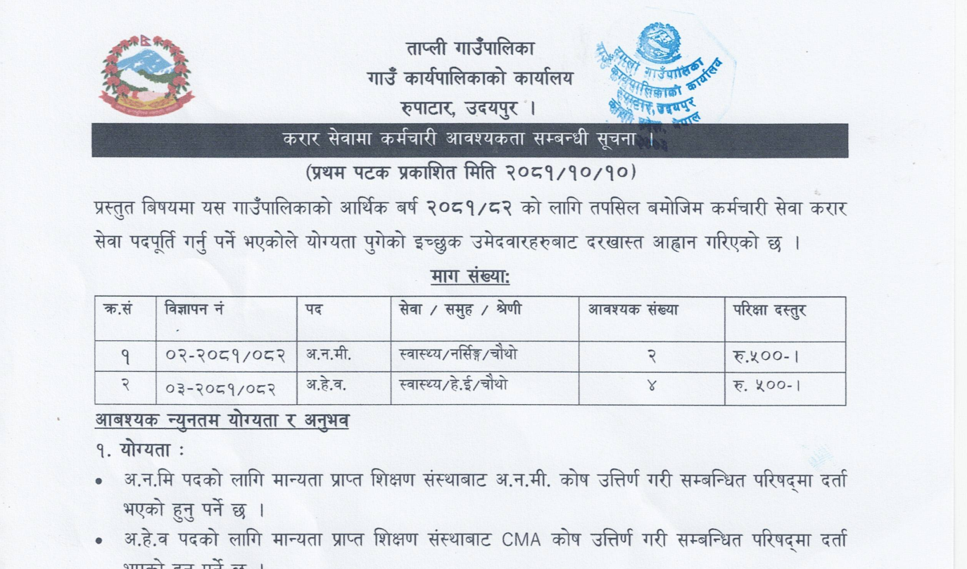 ताप्ली गाउँपालिका उदयपुरमा AHW, ANM आवश्यकता सम्बन्धी सूचना
