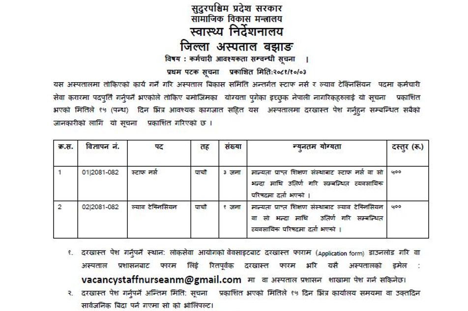 जिल्ला अस्पताल बझाङमा कर्मचारी आवश्यकता सम्बन्धी सूचना
