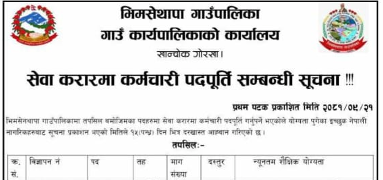भिमसेन गाउँपालिका गोरखामा कर्मचारी आवश्यकता सम्बन्धी सूचना