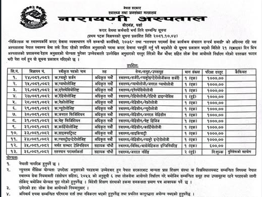 नारायणी अस्पतालमा सेवामा कर्मचारी आवश्यकता सम्बन्धी सूचना !