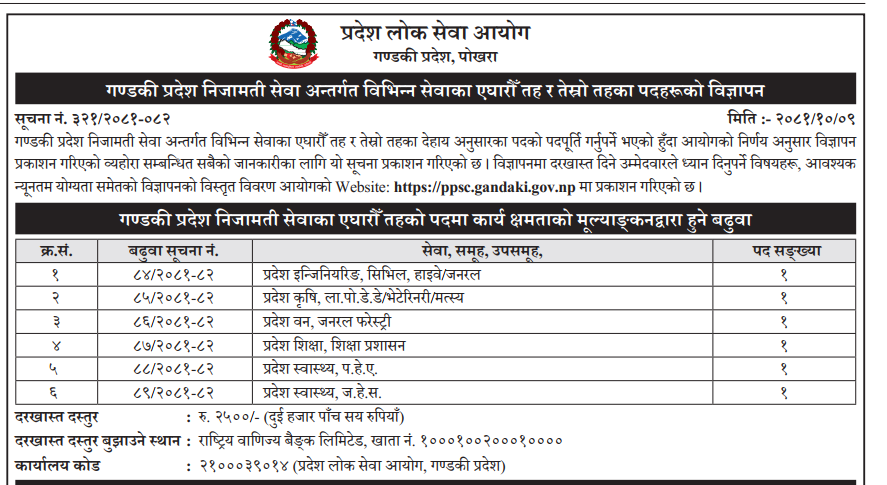 गण्डकी प्रदेश निजामती सेवा अन्तर्गत विभिन्न सेवाका एघारौं तह र तेस्रो तहका पदहरूको विज्ञापन