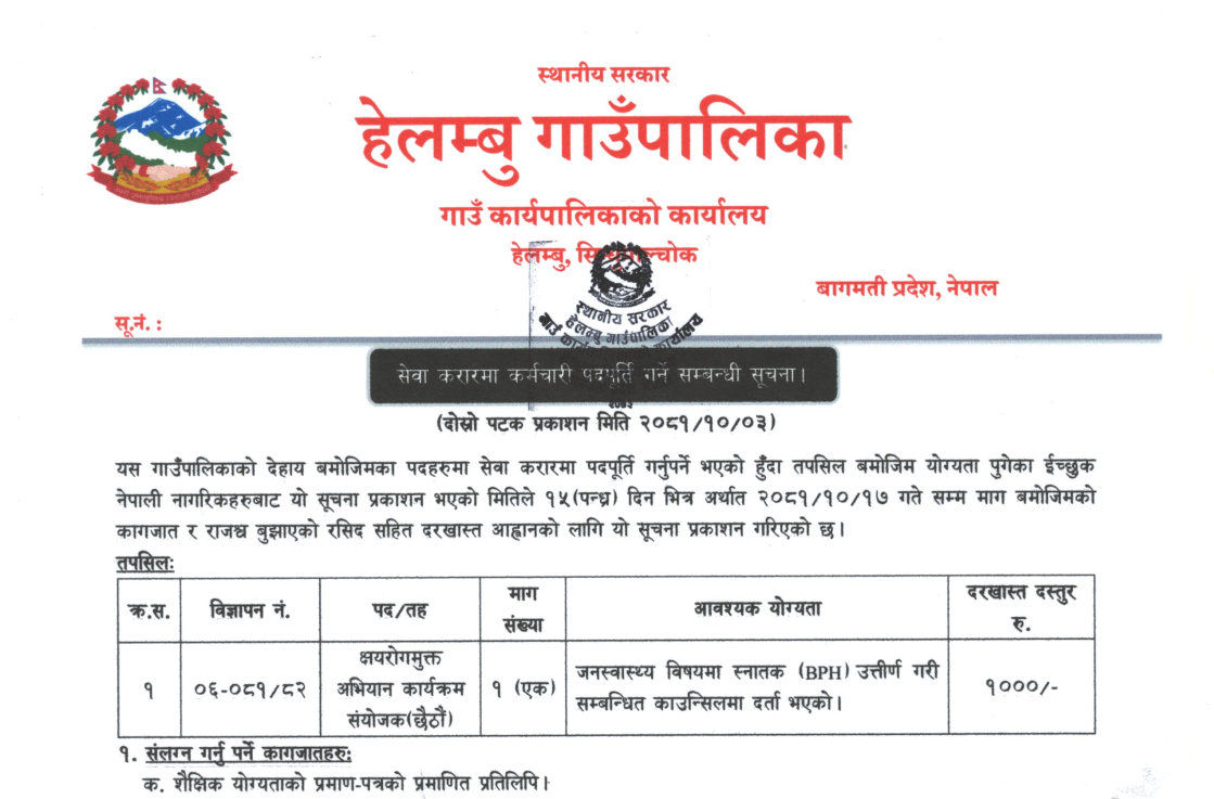 हेलम्बु गाउँपालिकामा क्षयरोग मुक्त अभियान कार्यक्रमका लागि कार्यक्रम संयोजक करारमा लिने सम्बन्धी सूचना !