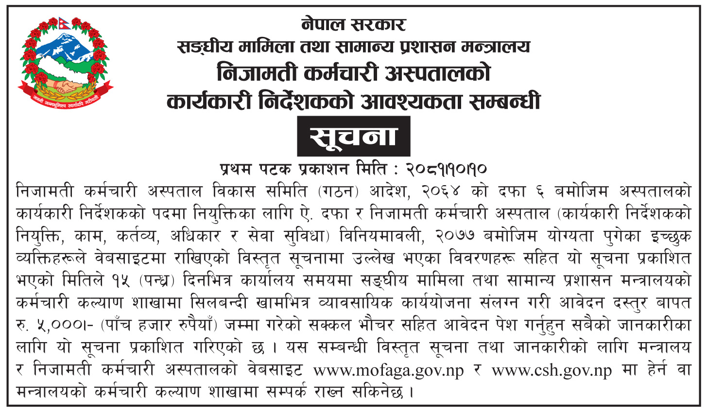सङ्घीय मामिला तथा सामान्य प्रशासन मन्त्रालय निजामती कर्मचारी अस्पतालको कार्यकारी निर्देशकको आवश्यकता सम्बन्धी सूचना