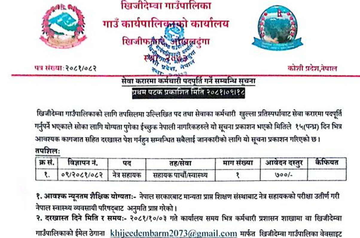खिजीदेम्वा गाउँपालिकामा कर्मचारी आवश्यकता सम्बन्धी सूचना