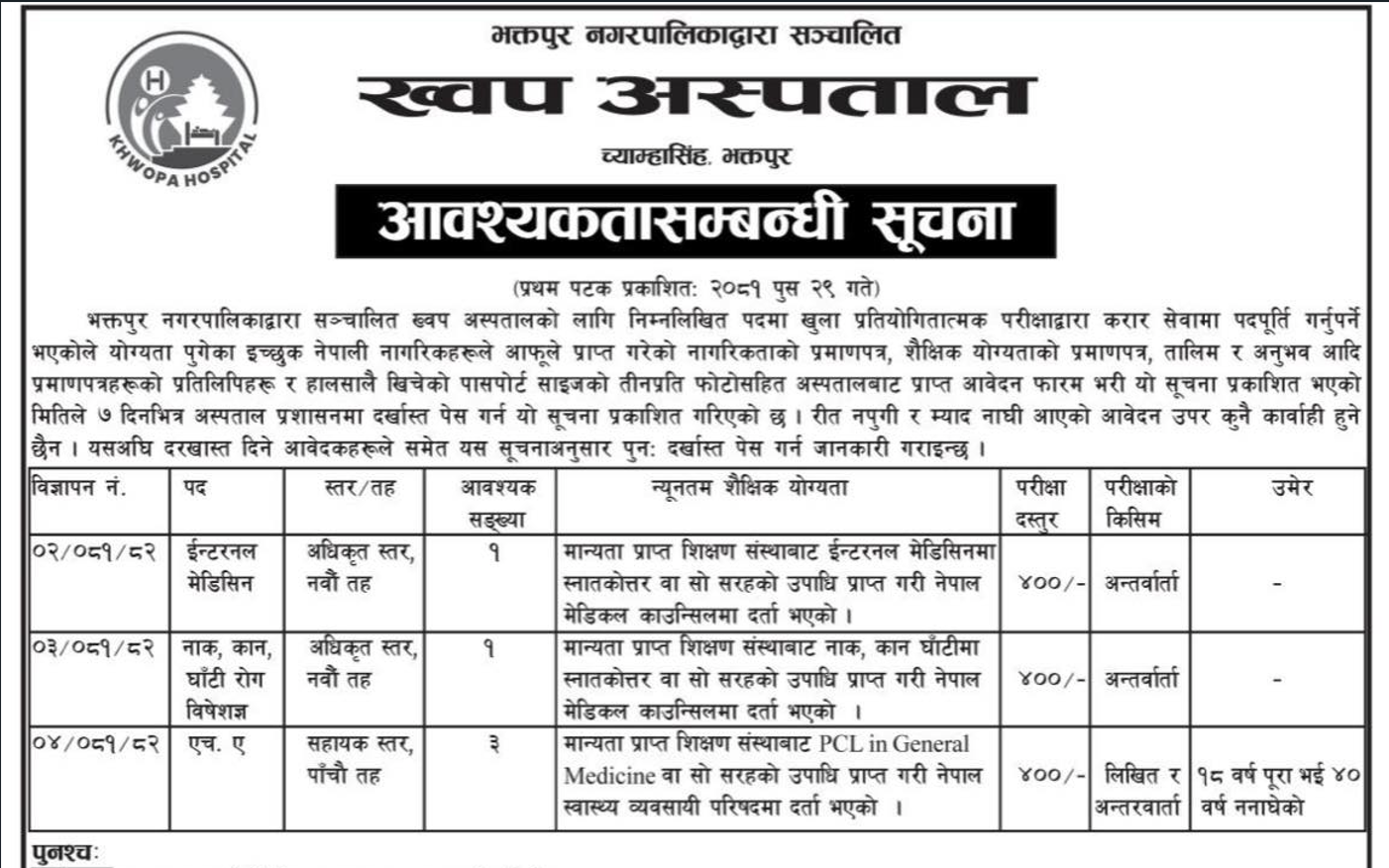 ख्वप अस्पताल भक्तपुरमा कर्मचारी आवश्यकता सम्बन्धी सूचना