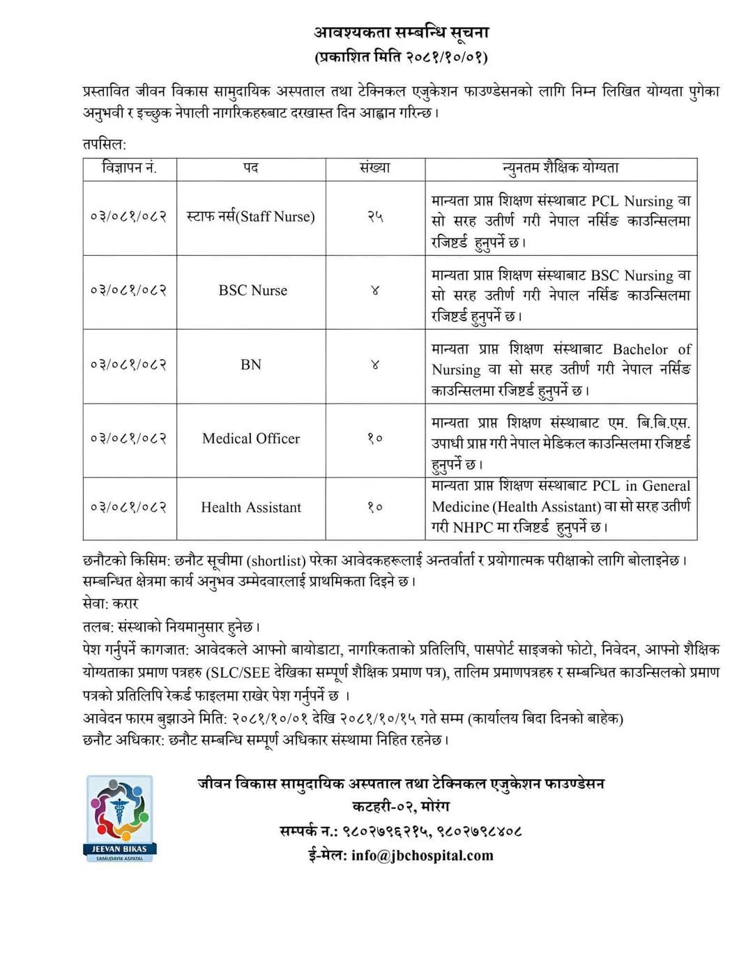 जीवन विकास सामुदायिक अस्पताल तथा टेक्निकल एजुकेसन फाउन्डेसन कटहरी मोरङमा कर्मचारी आवश्यकता सम्बन्धी सूचना