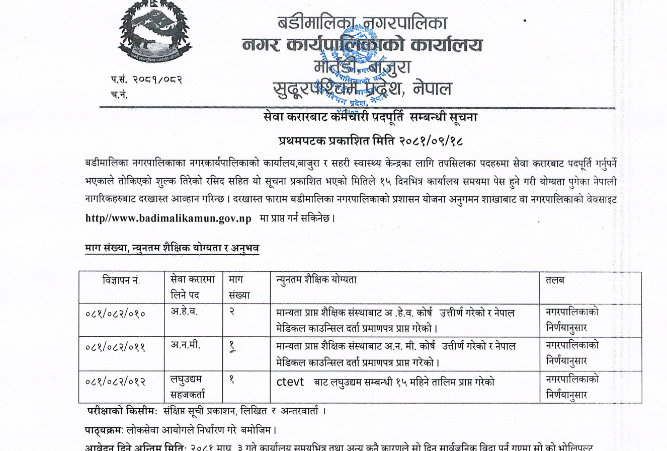 बडीमालिका नगरपालिका बाजुरामा कर्मचारी आवश्यकता सम्बन्धी सूचना
