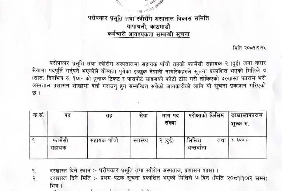 Vacancy Announcement at Paropakar Maternity and Women's Hospital