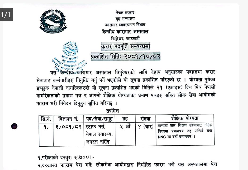 केन्द्रीय कारागार अस्पतालमा स्टाफ नर्स आवश्यकता सम्बन्धी सूचना