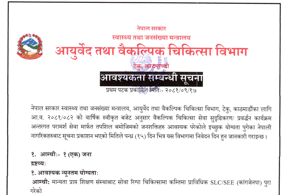 आयुर्वेद तथा वैकल्पिक चिकित्सा विभागको आम्ची आवश्यकत्ता सम्बन्धी सूचना
