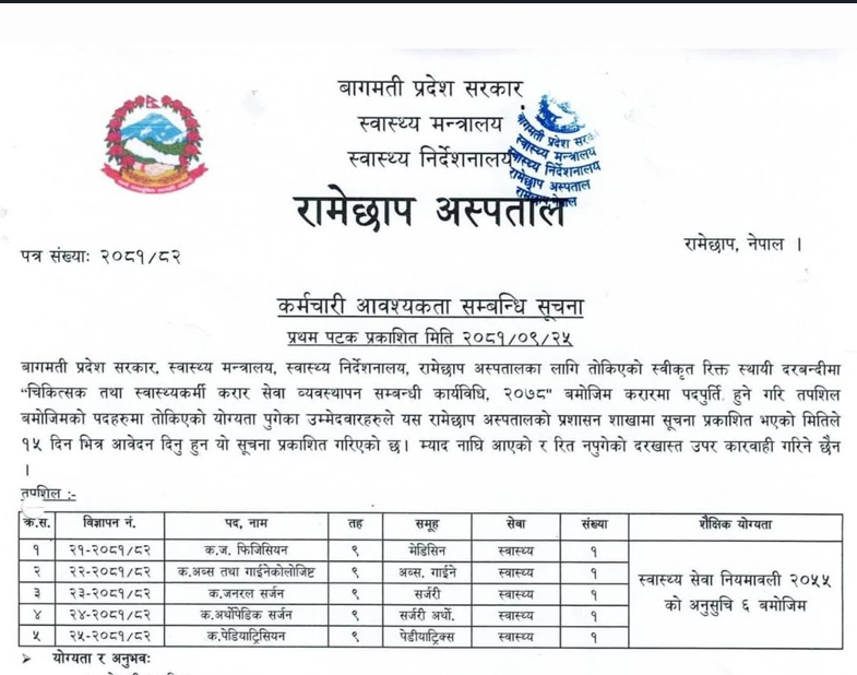 रामेछाप अस्पतालमा चिकित्सक आवश्यकता सम्बन्धी सूचना