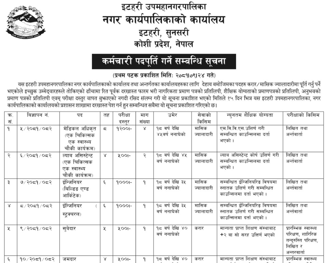 इटहरी उप–महानगरपालिकामा कर्मचारी आवश्यकता सम्बन्धी सूचना