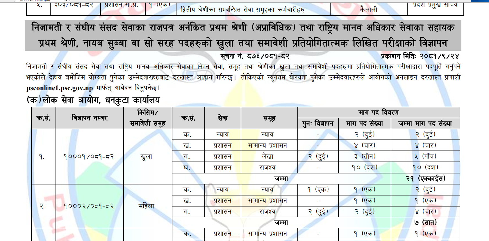 निजामती र संघीय संसद सेवाका राजपत्र अनंकित प्रथम श्रेणी (अप्राविधिक), ना.सु. वा सो सरह तथा मानव अधिकार सेवाका सहायक प्रथम श्रेणीका पदहरूको विज्ञापन (बढुवा, खुला तथा समावेशी)